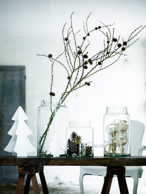 Fijaos cómo con unas piñas, unas ramitas y unas sencillas bolas de navidad metidas en unos cuencos de cristal, podemos adornar una estantería o una encimera.