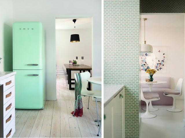 Por ejemplo podemos pintar unas sillas antiguas de verde menta, o elegir elementos de mobiliario como un frigorífico, unas lámparas, una vajilla o una tela bonita para tapizar.