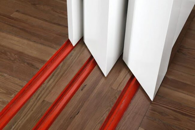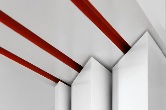 Y como los carriles, situados en suelo y techo, iban a quedar ocultos, los pintaron de rojo, para que contrastara con la tarima y con el techo (si no puedes contra el enemigo, únete a él, no?) Hay veces que es mucho mejor no ocultar las cosas, ya que puede quedar una “chapucilla”.