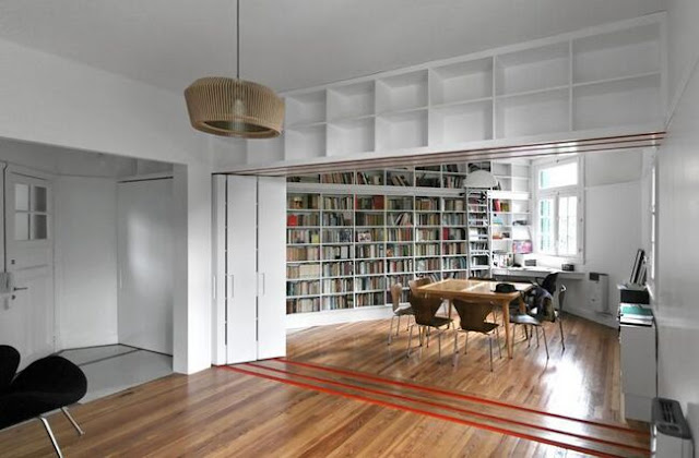 Se trata de un apartamento situado en Buenos Aires, con poco espacio y muchos libros, y con unos dueños apasionados por la lectura. Así que a los arquitectos se les ocurrió diseñar un mueble librería, partido en tres módulos, y que a su vez pudieran correr por unos carriles.